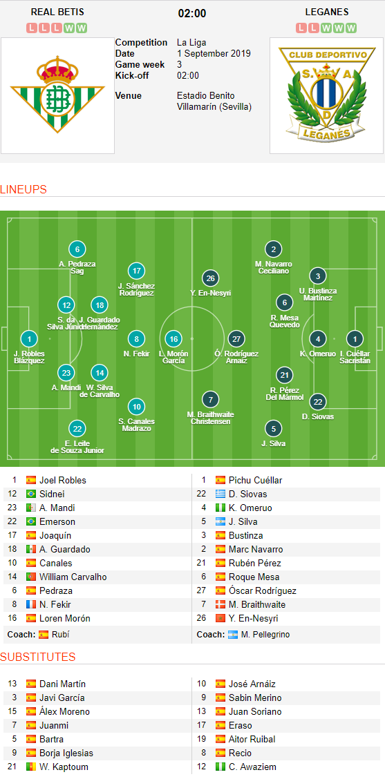 Cập nhật nhanh nhất, chính xác nhất ĐỘI HÌNH RA SÂN trận Betis vs Leganes diễn ra lúc 02h00 ngày 01/9 trong khuôn khổ vòng 3 giải VĐQG Tây Ban Nha.