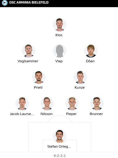 Bielefeld (4-4-2): Stefan Ortega; Cedric Brunner, Amos Pieper, Mike van der Hoorn, Nathan de Medina; Fabian Kunze, Manuel Prietl; Christian Gebauer, Michel Vlap, Andreas Voglsammer; Fabian Klos.