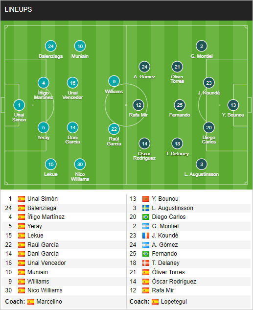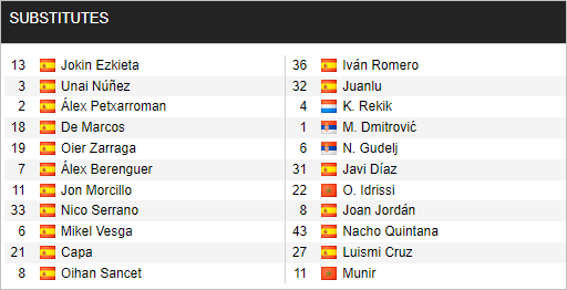 - Bilbao: Peru Nolaskoain, Yuri Berchiche và Asier Villalibre vắng mặt vì chấn thương; trong khi Dani Vivian vẫn chưa chắc ra sân.