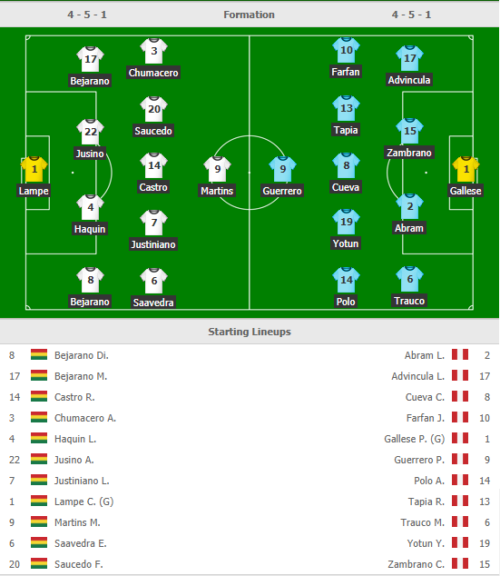 Bolivia (4-2-3-1): Lampe - Bejarano, Jusino, Haquin, Bejarano - Galind, Castro - Chumacero, Justiniano, Saavedra - Martins