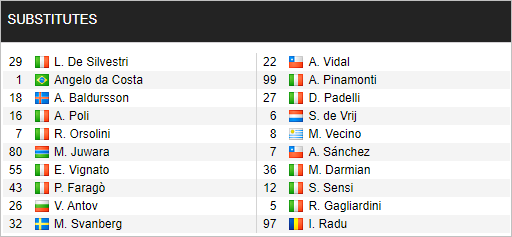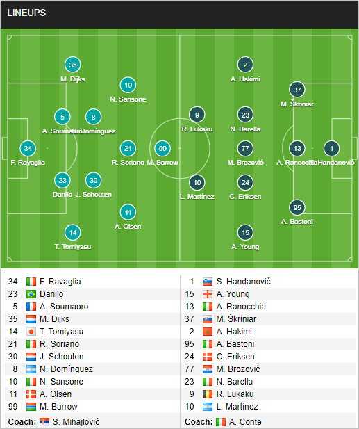 Inter Milan: Handanovic; Skriniar, Ranocchia, Bastoni; Hakimi, Barella, Brozovic, Gagliardini, Perisic; Martinez, Lukaku.