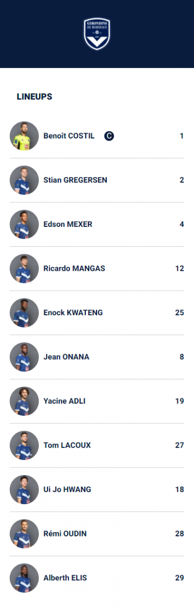 - Bordeaux: Laurent Koscielny vắng mặt vì chấn thương; Paul Baysse không đủ thể lực để thi đấu, còn Josh Maja vẫn chưa chắc chắn ra sân.