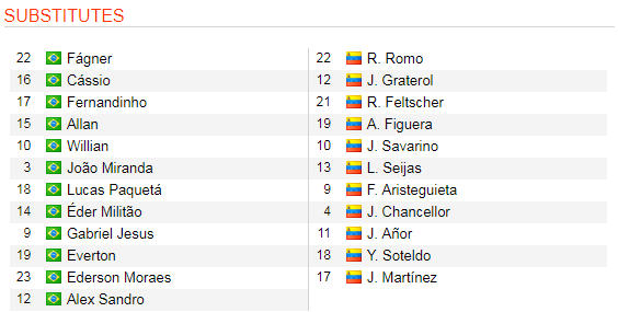 - Brazil: Neymar chấn thương và không thể tham dự giải đấu trong khi thủ thành Ederson bị đau nhẹ. Marcelo, Fabinho, Felipe Anderson, Paulinho, Renato Augusto, Lucas Moura và Douglas Costa không được triệu tập.