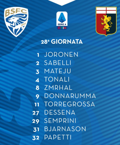 Brescia: Joronen; Papetti, Chancellor, Martella, Sabelli, Dessena, Bisoli, Bjarnason, Zmrhal, Aye, Torregrossa.