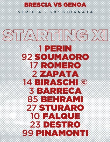 Genoa: Perin; Soumaoro, Romero, Masiello, Criscito, Sturaro, Schöne, Cassata, Biraschi, Favilli, Pandev.