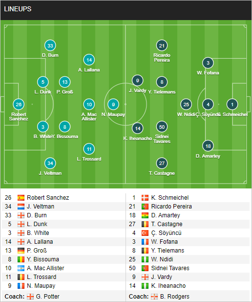 AEGoal cập nhật chính xác ĐỘI HÌNH RA SÂN trận Brighton vs Leicester City diễn ra lúc 03h00 ngày 07/3 trong khuôn khổ vòng 27 - Ngoại hạng Anh