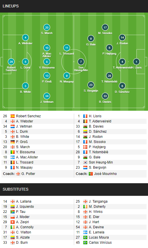 AEGoal cập nhật chính xác ĐỘI HÌNH RA SÂN trận Brighton vs Tottenham diễn ra lúc 02h15 ngày 01/02 trong khuôn khổ Vòng 21 - Ngoại hạng Anh.