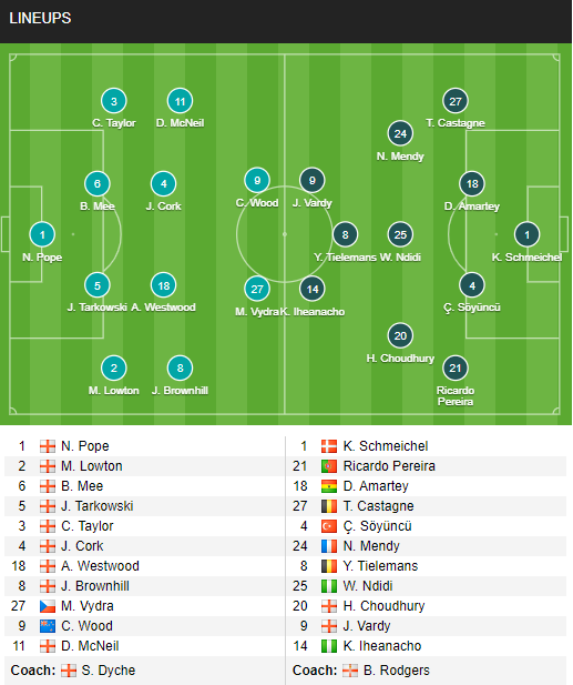 Burnley: Pope, Lowton, Mee, Tarkowski, Taylor, Cork, Westwood, Brownhill, Vydra, Rodriguez, McNeil.