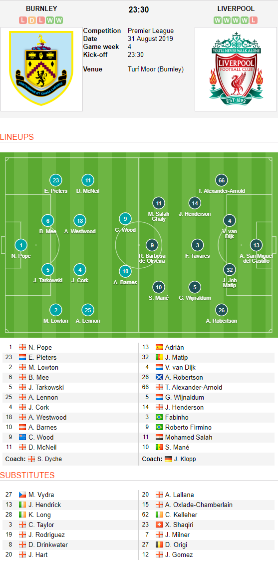 Cập nhật nhanh nhất, chính xác nhất ĐỘI HÌNH RA SÂN trận Burnley vs Liverpool diễn ra lúc 23h30 ngày 31/8 trong khuôn khổ vòng 4 giải Ngoại hạng Anh.