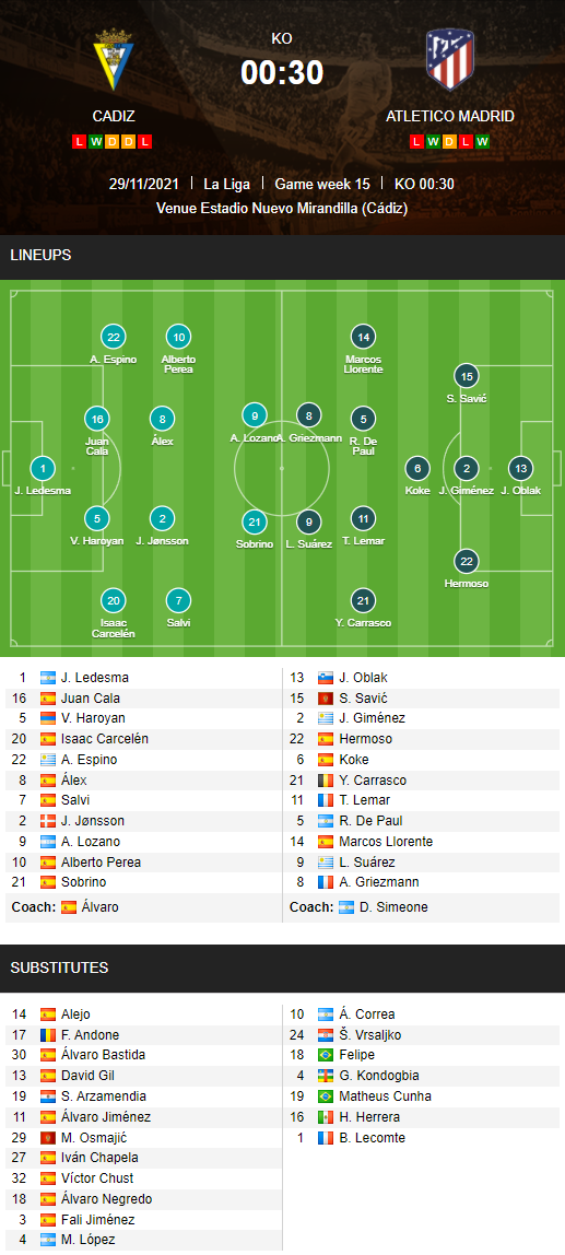 ĐỘI HÌNH RA SÂN trận Cadiz vs Atletico Madrid, 00h30 ngày 29/11: VĐQG Tây Ban Nha