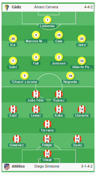 Atletico Madrid: Oblak; Llorente, Savic, Giménez, Felipe, Saúl; Torreira, Koke, Lemar; Joao Félix, Luis Suárez.