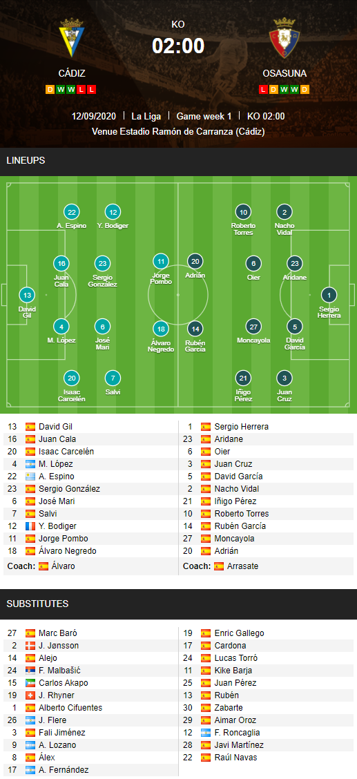 AEGoal.net cập nhật chính xác ĐỘI HÌNH RA SÂN trận Cadiz vs Osasuna diễn ra lúc 02h00 ngày 13/9 trong khuôn khổ Vòng 1 - VĐQG Tây Ban Nha.