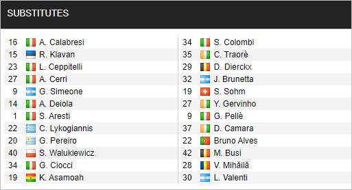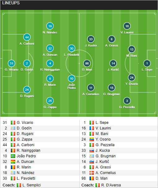 Cagliari (3-5-2): Guglielmo Vicario (GK); Ragnar Klavan, Diego Godin, Daniele Rugani; Nahitan Nandez, Alfred Duncan, Radja Nainggolan, Razvan Marin, Charalambos Lykogiannis; Joao Pedro, Giovanni Simeone.