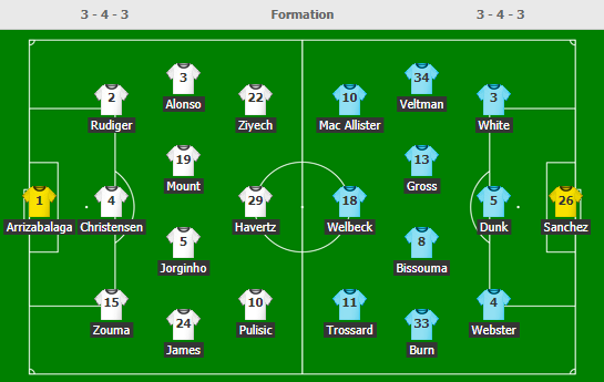 Brighton: Sanchez; White, Dunk, Veltman; Gross, Lallana, Bissouma, Moder; Trossard, Maupay, Welbeck