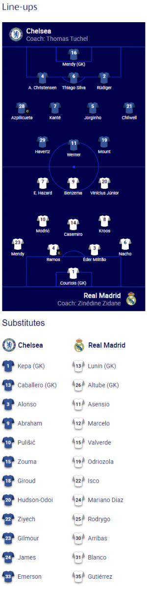 AEGoal cập nhật chính xác ĐỘI HÌNH RA SÂN trận Chelsea vs Real Madrid diễn ra lúc 02h00 ngày 06/05 trong khuôn khổ UEFA Champions League.