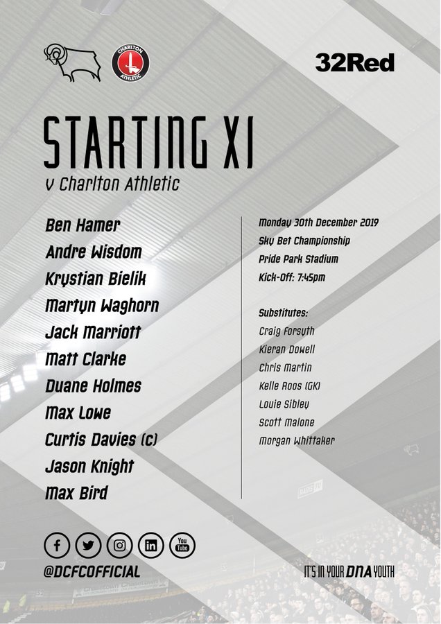 AEGoal.net cập nhật chính xác ĐỘI HÌNH RA SÂN trận Derby County vs Charlton diễn ra lúc 02h45 ngày 31/12 trong khuôn khổ Vòng 25 - Hạng Nhất Anh.