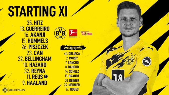 Dortmund (4-3-3): Hitz - Morey, Akanji, Hummels, Guerreiro - Bellingham, Delaney, Dahoud - Reus (c), Haaland, Hazard