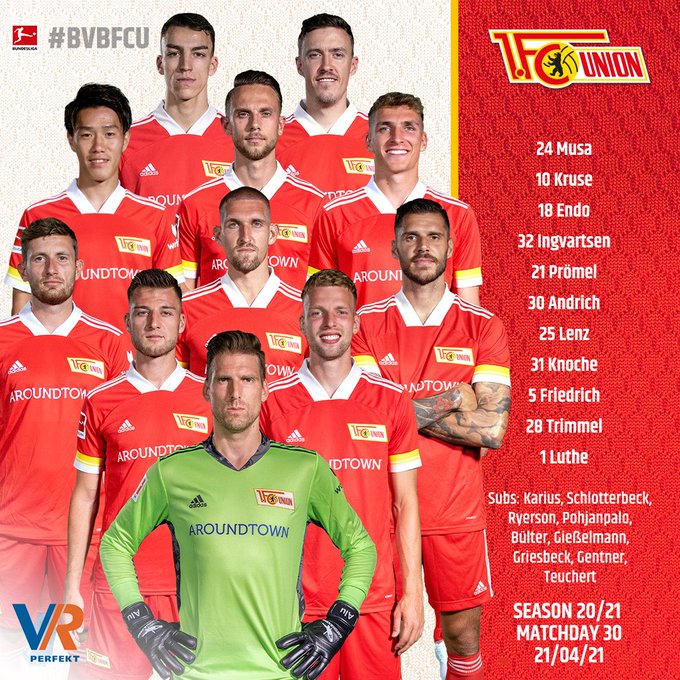 Union Berlin (3-4-2-1): Luthe - Friedrich, Knoche, Schlotterbeck - Trimmel (c), Andrich, Promel, Lenz - Endo, Kruse – Musa