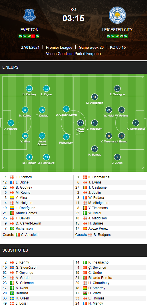 AEGoal cập nhật chính xác ĐỘI HÌNH RA SÂN trận Everton vs Leicester City diễn ra lúc 03h15 ngày 28/01 trong khuôn khổ vòng 20 - giải Ngoại hạng Anh.