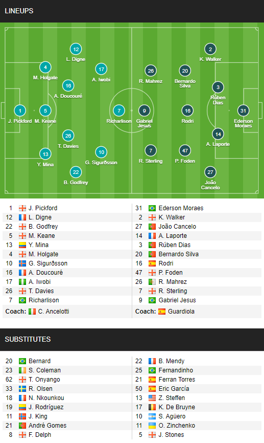 AEGoal cập nhật chính xác ĐỘI HÌNH RA SÂN trận Everton vs Man City diễn ra lúc 03h15 ngày 18/02 trong khuôn khổ giải Ngoại hạng Anh.