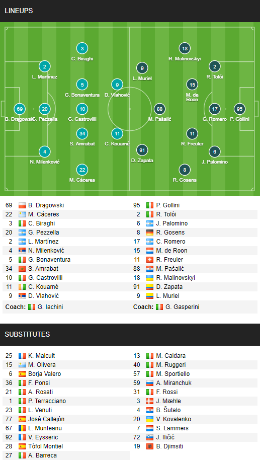 Atalanta (4-2-3-1): Gollini - Toloi, Romero, Djimsiti, Gosens - Freuler, De Roon - Malinoskyi, Pasalic, Muriel - Zapata