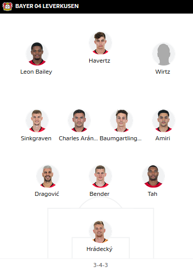 Leverkusen: Hradecky - Tah, S. Bender, Dragovic - Amiri, Aranguiz, Baumgartlinger, Sinkgraven - Wirtz, Havertz (c), Bailey.