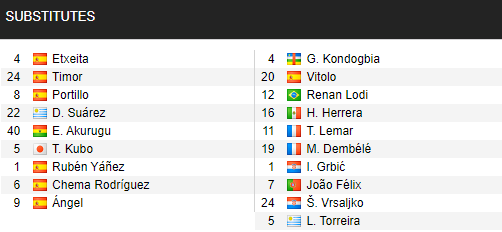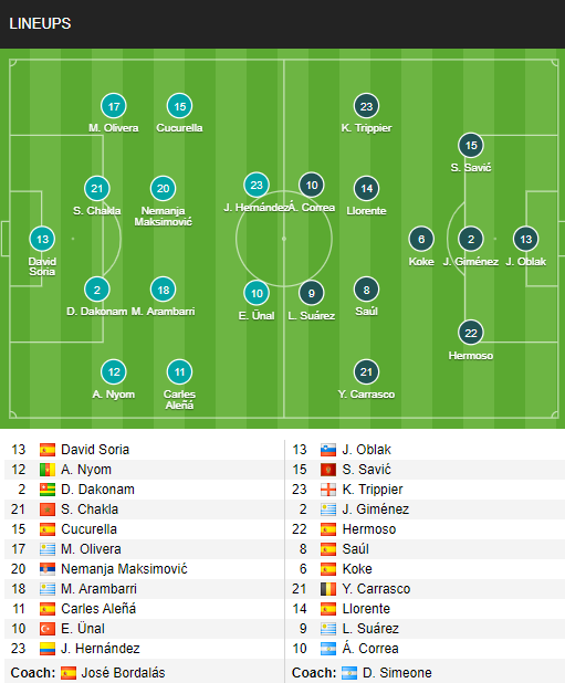 - Atletico Madrid: Vắng Felipe (treo giò); Khả năng ra sân của Jose Gimenez còn bỏ ngỏ.