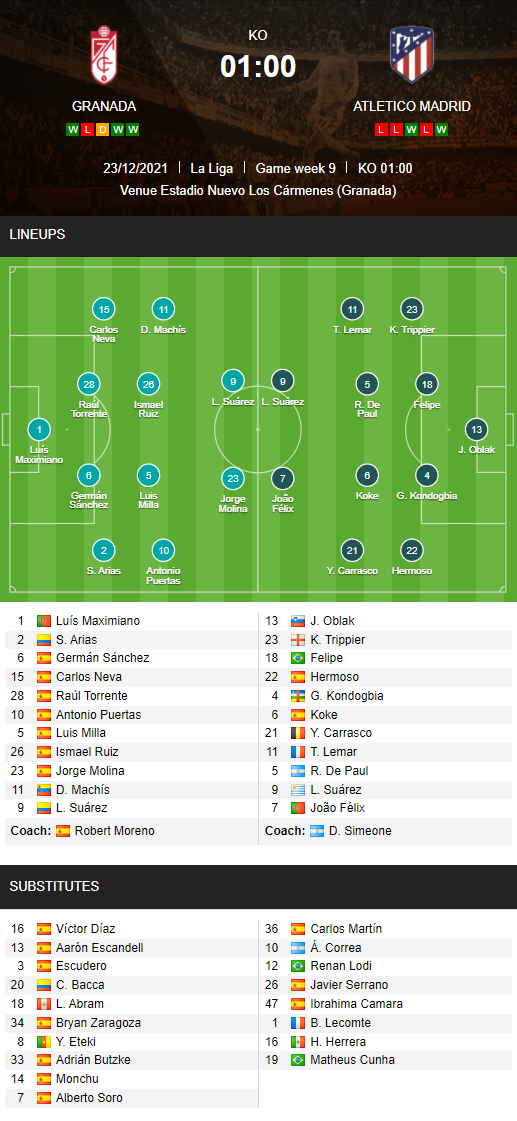 ĐỘI HÌNH RA SÂN trận Granada vs Atletico Madrid, 01h00 ngày 23/12: VĐQG Tây Ban Nha