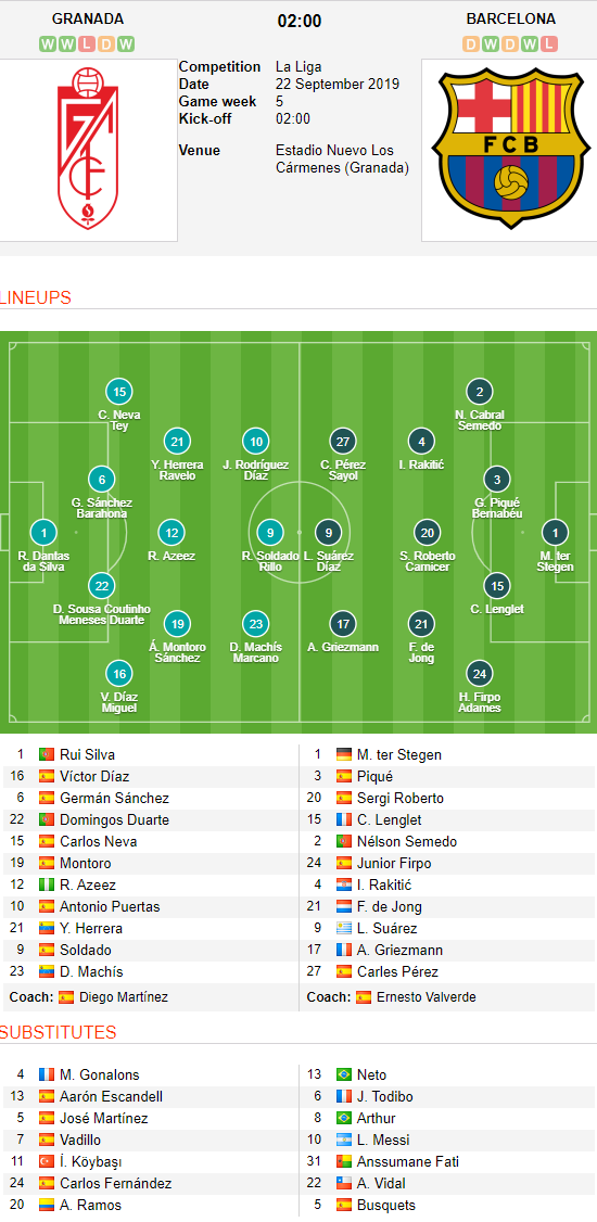 AEGoal.net cập nhật chính xác ĐỘI HÌNH RA SÂN trận Granada vs Barcelona diễn ra lúc 02h00 ngày 22/9 trong khuôn khổ vòng 5 La Liga.