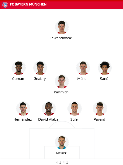 Bayern Munich: Neuer (c) - Pavard, Süle, Alaba, Hernandez - Kimmich - Coman, Gnabry, Müller, Sane - Lewandowski.