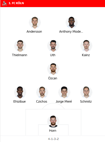 Koln: Horn; Schmitz, Mere, Czichos, Hector; Skhiri, Kainz, Duda, Uth; Andersson, Modeste