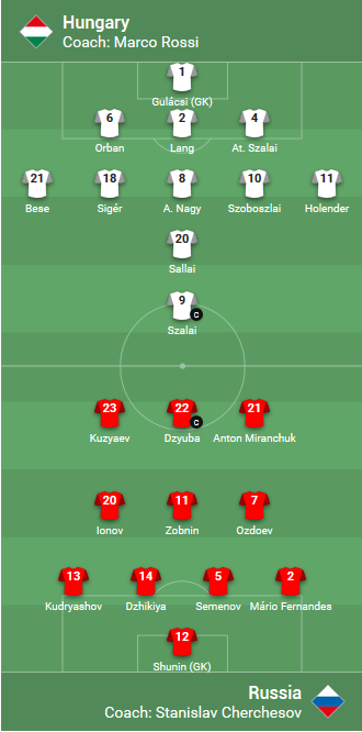 AEGoal.net cập nhật chính xác ĐỘI HÌNH RA SÂN trận Hungary vs Nga diễn ra lúc 23h00 ngày 6/9 trong khuôn khổ UEFA Nations League.