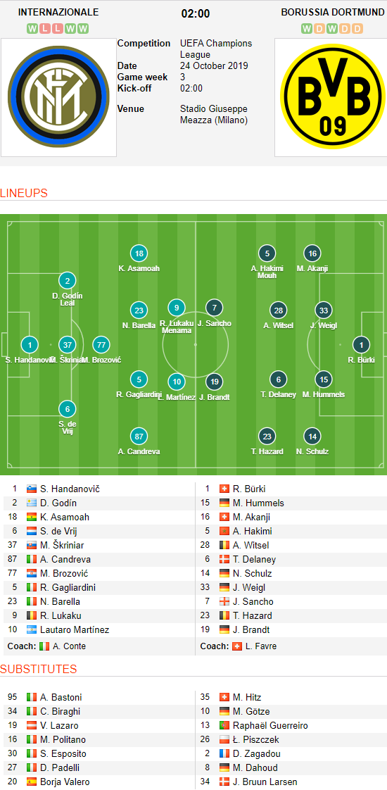 AEGoal.net cập nhật chính xác ĐỘI HÌNH RA SÂN trận Inter Milan vs Dortmund diễn ra lúc 02h00 ngày 24/10 trong khuôn khổ Bảng F - UEFA Champions League.