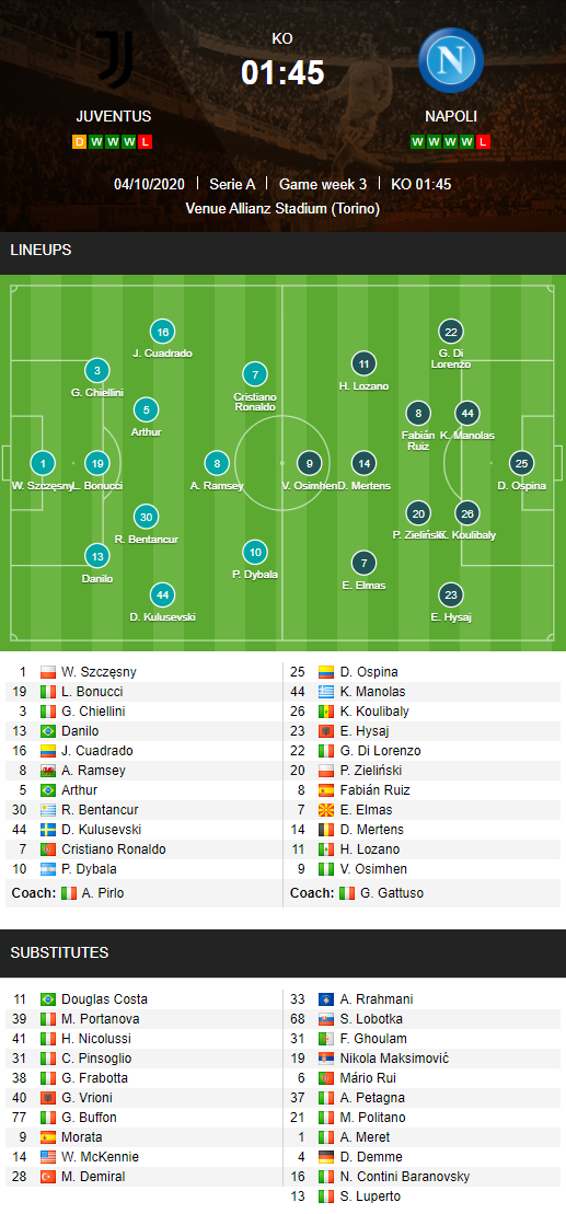 AEGoal.net cập nhật chính xác ĐỘI HÌNH RA SÂN trận Juventus vs Napoli diễn ra lúc 01h45 ngày 05/10 trong khuôn khổ Vòng 3 - VĐQG Italia