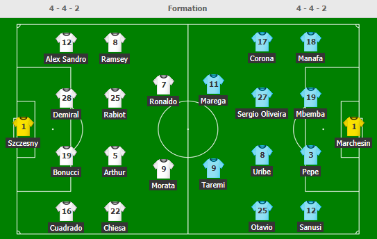 - Juventus (4-4-2): Szczesny - Cuadrado, Bonucci, De Ligt, Alex Sandro - Chiesa, Rabiot, Arthur, Ramsey - Morata, Ronaldo