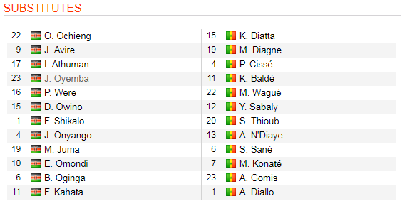 Kenya: Matasi, Owino, Omar, Mohammed, Okumu, Kahata, Ouma, Wanyama, Omolo, Masika, Olunga.