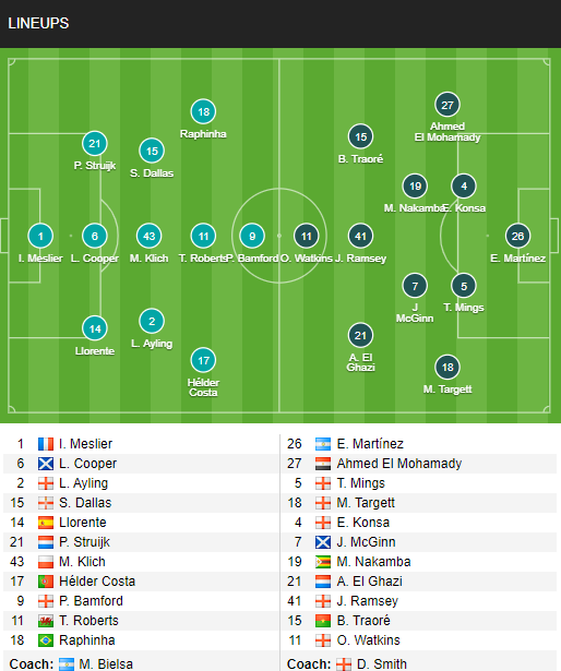 - Leeds Utd: Vắng Robin Koch, Rodrigo, Gaetano Berardi, Kalvin Phillips, Ivan Poveda-Ocampo và Adam Forshaw (chấn thương); Khả năng ra sân của Mateusz Klich và Jamie Shackleton còn bỏ ngỏ.