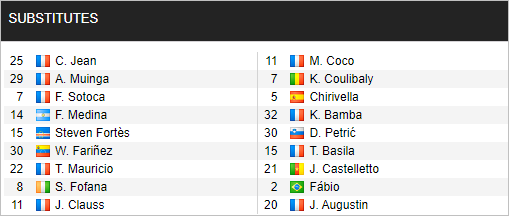 Lens (3-4-1-2): Leca; Gradit, Bade, Medina; Doucoure, Fofana, Clauss, Haidara; Kakuta; Jean, Sotoca.