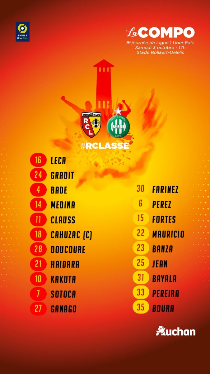 Lens: Leca; Medina, Bade, Gradit; Clauss, Doucoure, Cahuzac, Haidara; Kakuta; Ganago, Sotoca.