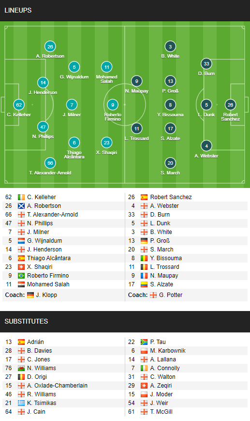 AEGoal cập nhật chính xác ĐỘI HÌNH RA SÂN trận Liverpool vs Brighton diễn ra lúc 03h15 ngày 04/02 trong khuôn khổ giải Ngoại hạng Anh.