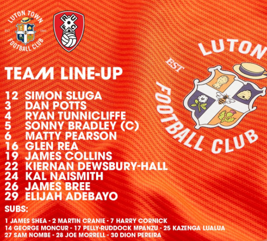 - Luton Town (4-2-3-1): Sluga; Naismith, Bradley, Pearson, James Bree; Ruddock, Tunnicliffe; LuaLua, Dewsbury-Hall, Jordan Clark; Adebayo.