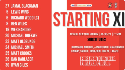 - Rotherham (3-5-1-1): Blackman; Giles, Richard Wood, Ihekwe; Harding, Ben Wiles, Barlaser, Lindsay, Olosunde; Ladipo; Michael Smith.