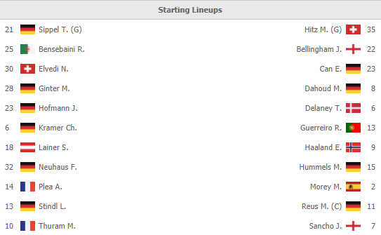 + Dortmund (4-2-3-1): Marwin Hitz; Raphael Guerreiro, Dan-Axel Zagadou, Emre Can, Thomas Meunier; Jude Bellingham, Julian Brandt; Giovanni Reyna, Thorgan Hazard, Nico Schulz; Erling Haaland.