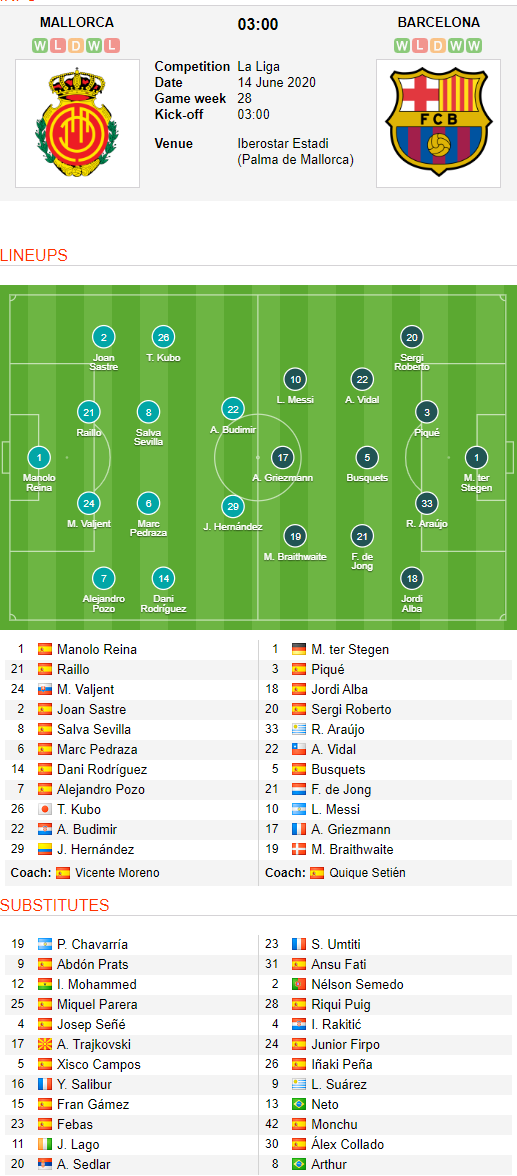 AEGoal.net cập nhật chính xác ĐỘI HÌNH RA SÂN trận Mallorca vs Barcelona diễn ra lúc 03h00 ngày 14/6 trong khuôn khổ vòng 28 giải VĐQG Tây Ban Nha.