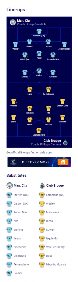 AEGoal cập nhật chính xác ĐỘI HÌNH RA SÂN trận Man City vs Club Brugge diễn ra lúc 03h00 ngày 04/11 trong khuôn khổ vòng bảng Cúp C1 châu Âu.