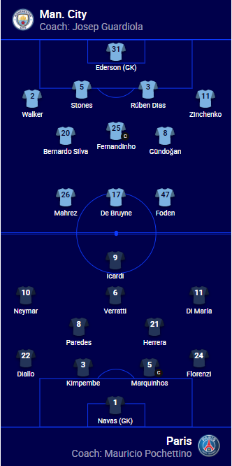 AEGoal cập nhật chính xác ĐỘI HÌNH RA SÂN trận Man City vs PSG diễn ra lúc 02h00 ngày 05/05 trong khuôn khổ UEFA Champions League.