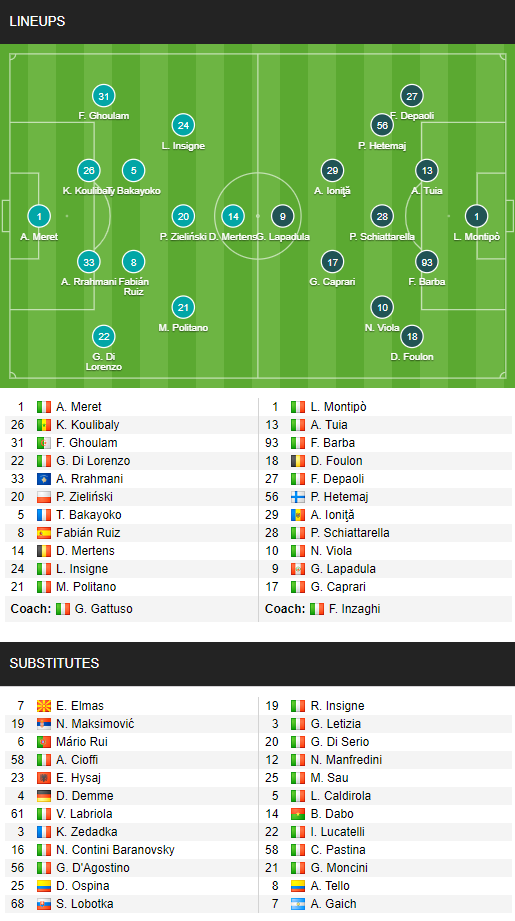 - Napoli (4-3-1-2): Meret - Di Lorenzo, Maksimovic, Koulibaly, Mario Rui - Elmas, Bakayoko, Ruiz - Zielinski - Politano, Insigne