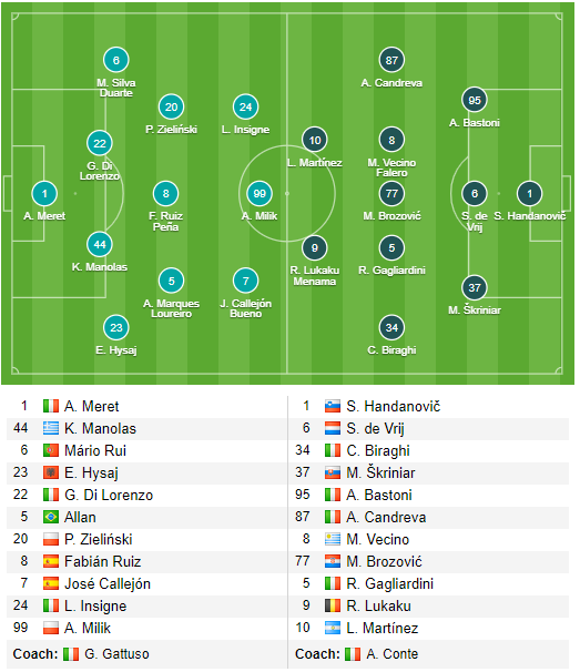 AEGoal.net cập nhật chính xác ĐỘI HÌNH RA SÂN trận Napoli vs Inter Milan diễn ra lúc 02h45 ngày 07/1 trong khuôn khổ Vòng 18 giải VĐQG Italia.