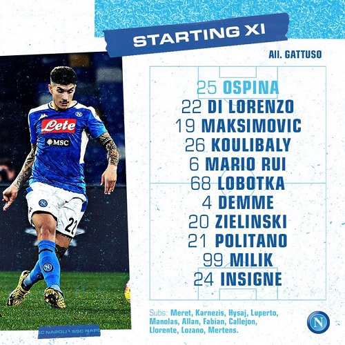 Napoli: Ospina; Di Lorenzo, Maksimovic, Koulibaly, Mario Rui; Lobotka, Demme, Zielinski; Politano, Milik, Insigne