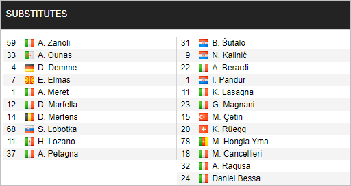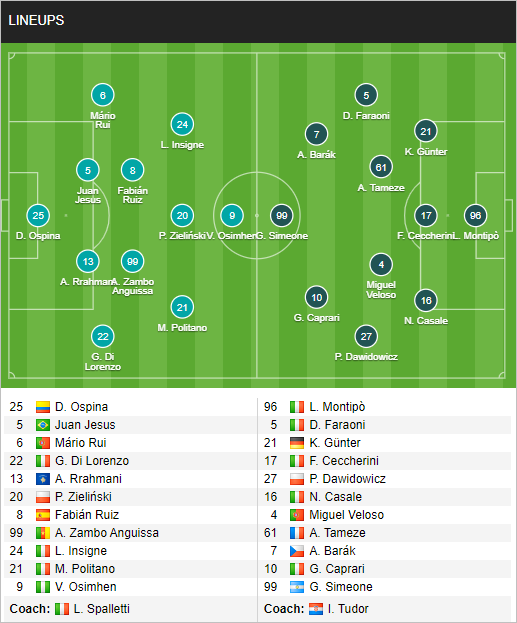 - Napoli: Malcuit, Manolas, Insigne, Osimhen, Fabián Ruiz chấn thương; Koulibaly bị treo giò.